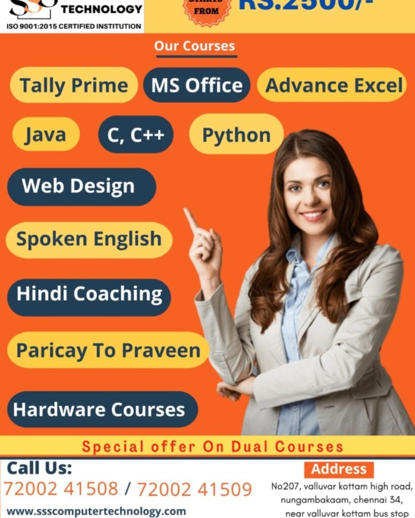 MS OFFICE COURSE: 📌FOR ADMIN RELATED JOBS YOU CAN CHOOSE MS OFFICE COURSE… 💥REG FEE:100 💥COURSE FEE:3000 📌IF SPOT REGISTRATION YOU’LL GET EXCLUSIVE OFFER OF DISCOUNT RS.500,AND WE PROVIDE 100%PRACTICALS… 📌COURSE DURATION -1 MONTH( MON TO FRI) 📌1 HOUR PER DAY… Read More »